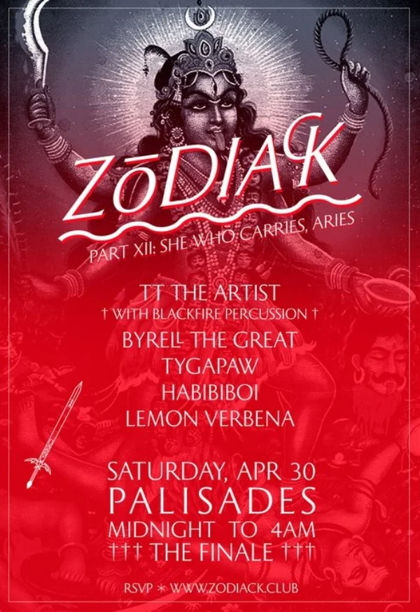 Fire. Might. The Four Horsewomen will set everything a-light. ZODIACK's 12-month event series comes to a close with the Aries Apocalypse grand finale. Gather into the molten inferno for a night of ferocious energy - featuring Baltimore's TT the Artist with Black Fire Percussion Drumline in addition to cathartic destruction from the brazen warbeats of DJs Byrell The Great, Tygapaw, west coast icon Habibiboi, and Lemon Verbena. Immersive visuals, installations, and performances on this night shall call upon a cleansing fire that will burn and spread like wildfire throughout the entirety of Brooklyn’s beloved Palisades.
