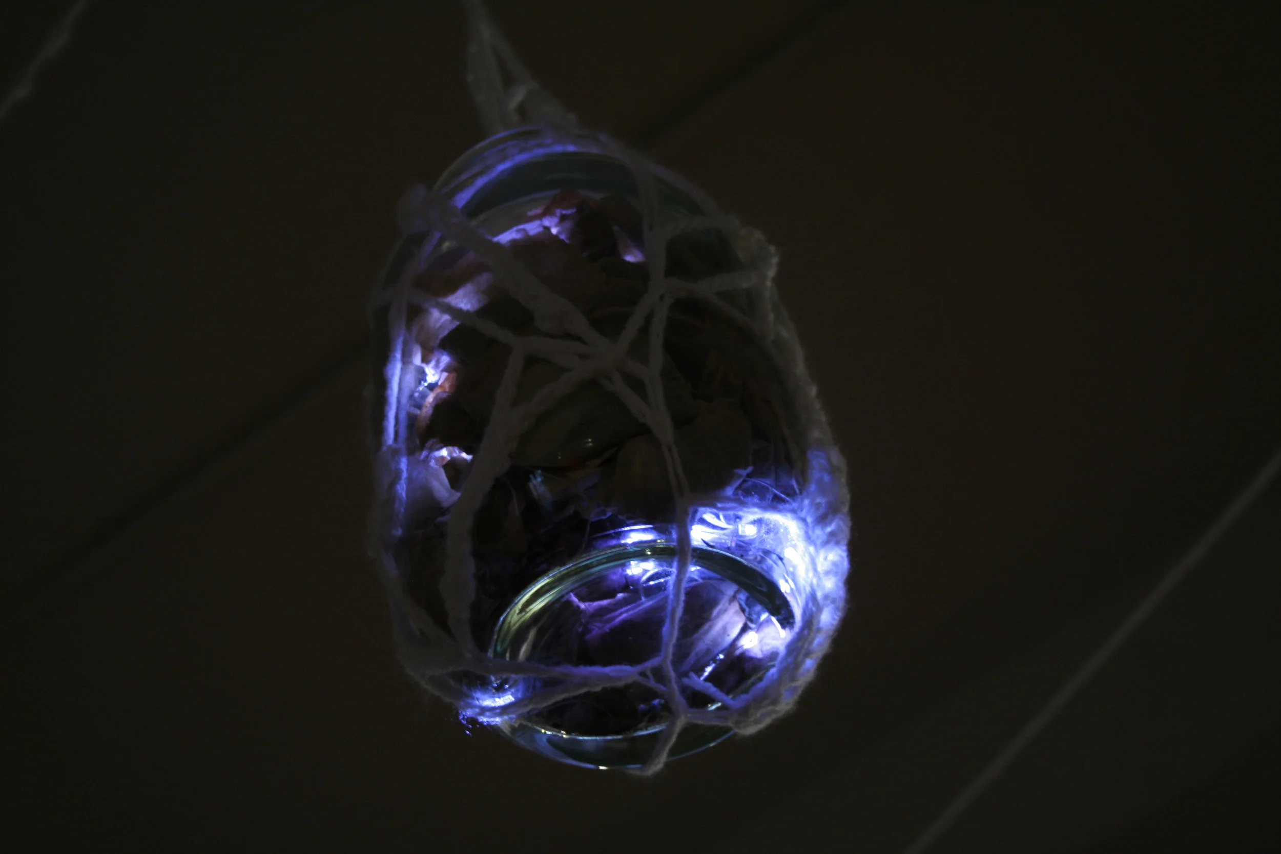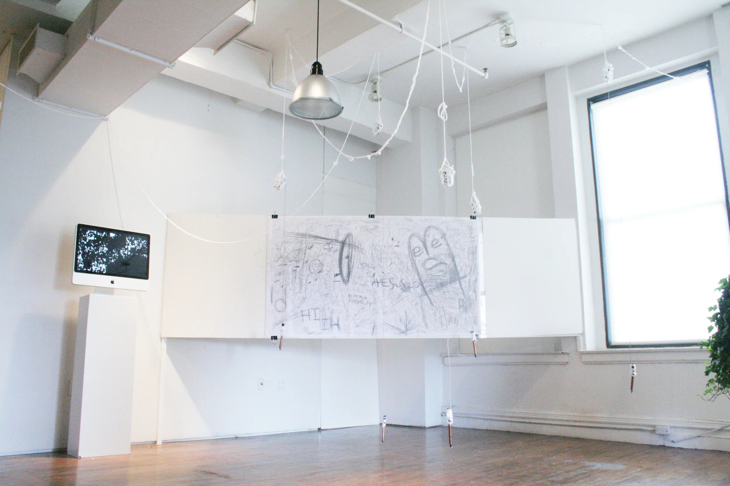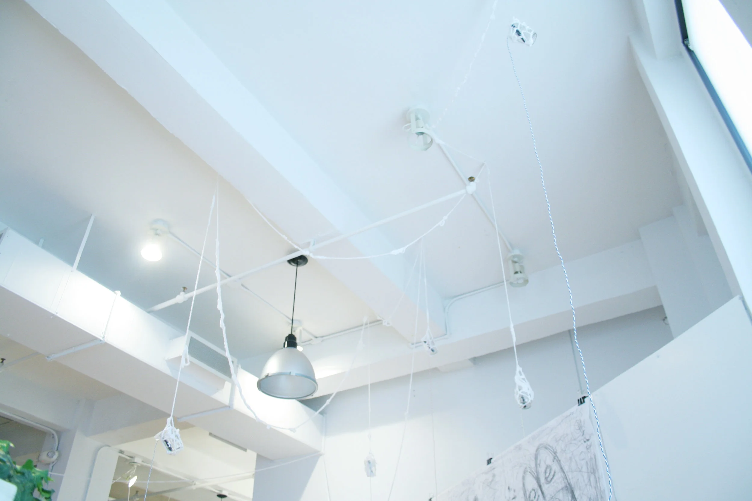 1. Participants draw on a light-sensing panel with electronic pencils hanging from the ceiling.